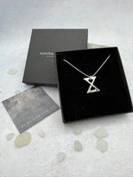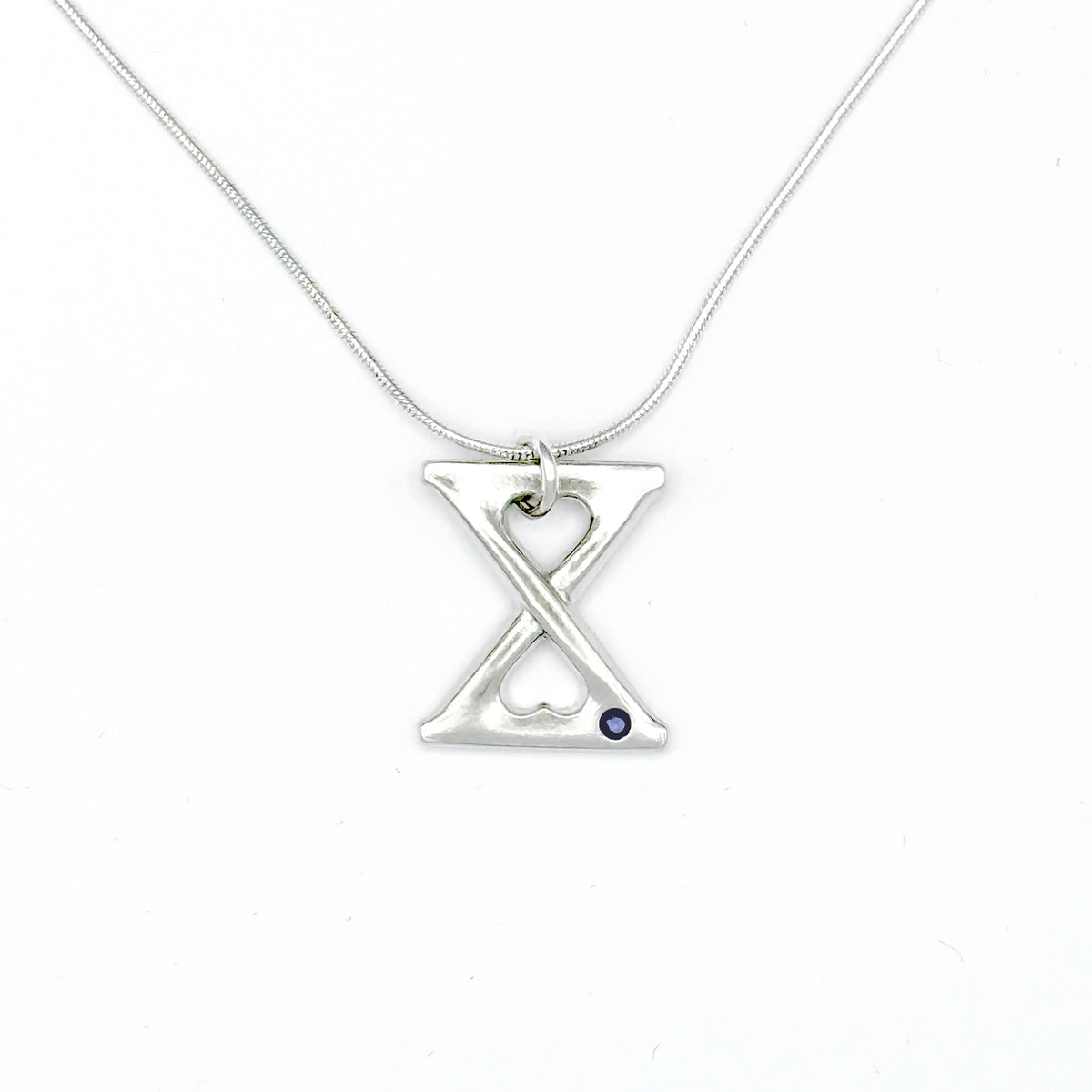 Incorporating a kiss, the Roman numeral for '10' and two hearts in one gorgeous handmade design. A vibrant sapphire inset shines against the pure Cornish tin making this pendant the perfect 10th wedding anniversary gift.