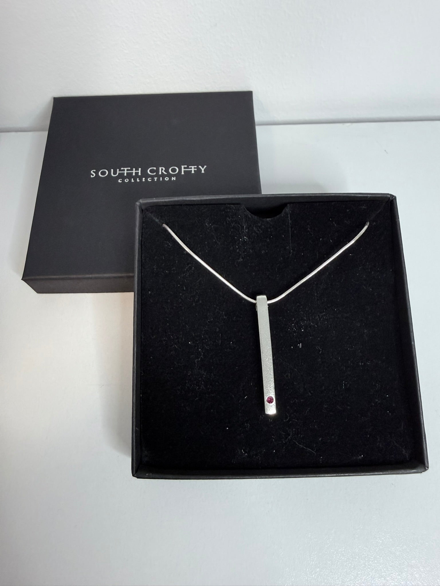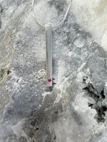 Crafted from pure Cornish tin, this elegant bar pendant features a striking ruby stone set within its minimalist design. Measuring approximately 35mm in height and 4mm in width, it offers refined understated luxury. Each piece arrives beautifully presented on an 18" sterlingsilver chain in a gift box accompanied by a certificate of authentication, making it an ideal choice for those who appreciate timeless jewellery with authentic provenance.